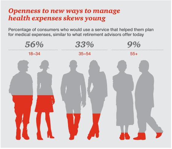 高免赔额医保计划无处不在。患者自付支出不断增长,无补偿的住院护理服务也在增加。面对这样的就医结算和支付系统,患者往往感到十分沮丧。在2016年,消费者将可以开始管理自己的医疗支出方式,采用那些类似于401k退休计划的新型医疗计划,进而影响整个行业。消费者,尤其是年轻消费者,对此表示出了浓厚的兴趣。根据2015年的HRI调查, 56%的18至34岁年轻人说,他们会使用那些用以帮助计划医疗支出的服务;在35至54岁人群中,这一比例为33%,而在55岁以上人群中,这一比例仅有9%。越来越多的财务顾问正在响应消费者的这种诉求,如五大财富管理公司已将医疗纳入长期理财规划,以帮助消费者做出更好的资金分配决策。