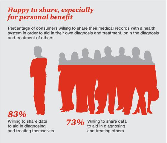 要推广这类数据库,光有医疗系统的努力还不够,消费者必须愿意分享他们的个人信息,才能推动这些新功能的应用。2015年的 HRI调查发现,大多数消费者都愿意与医生(88%)或当地医疗系统(78%)分享其医疗数据,但愿意将信息分享给制药公司的人却大大少于前两者(53%)。另据调查显示,人们更愿意为了自身的诊断和治疗而选择分享个人医疗信息(83%),而愿意因为他人的诊治需要而分享信息的人数则要少于前者(73%)。