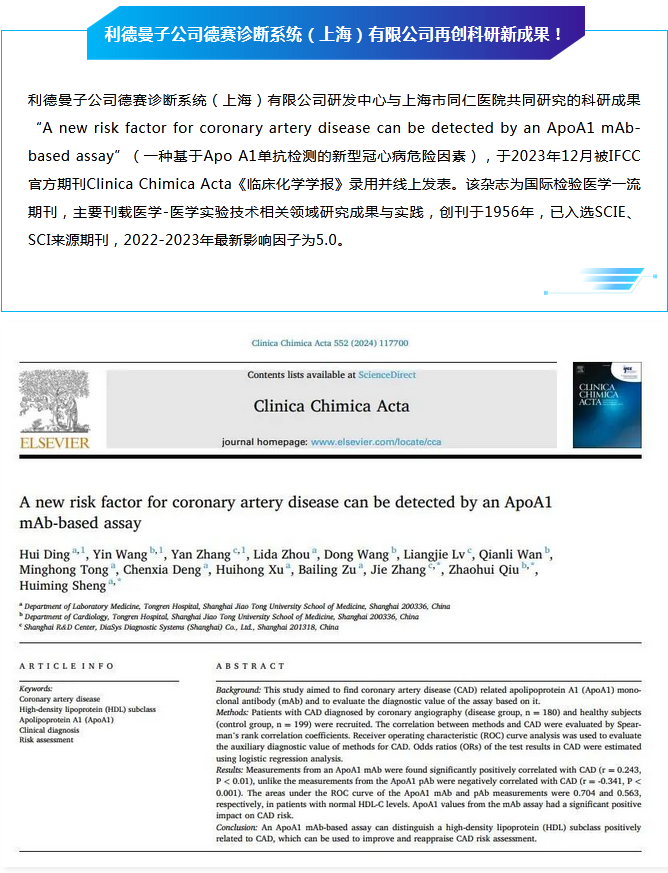 科研创新 │ B体育子公司德赛诊断系统(上海)有限公司联合上海市同仁医院再创科研新成果